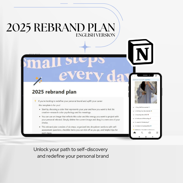 Notion template with a detailed 6-step plan featuring practical self-awareness exercises, tips to redefine your personal brand, enhance your skills, and position your professional profile.